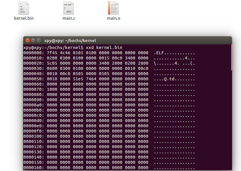 在kernel文件夹下打开终端输入命令:xxd kernel.bin 查看内核二进制文件的信息: