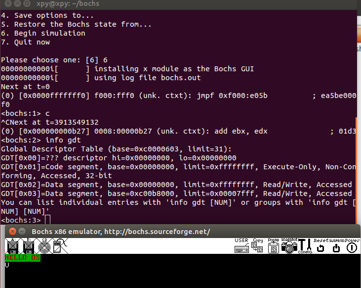 输入 ctrl+c,中断仿真,再输入info gdt 查看全局描述符表,其正确显示了: