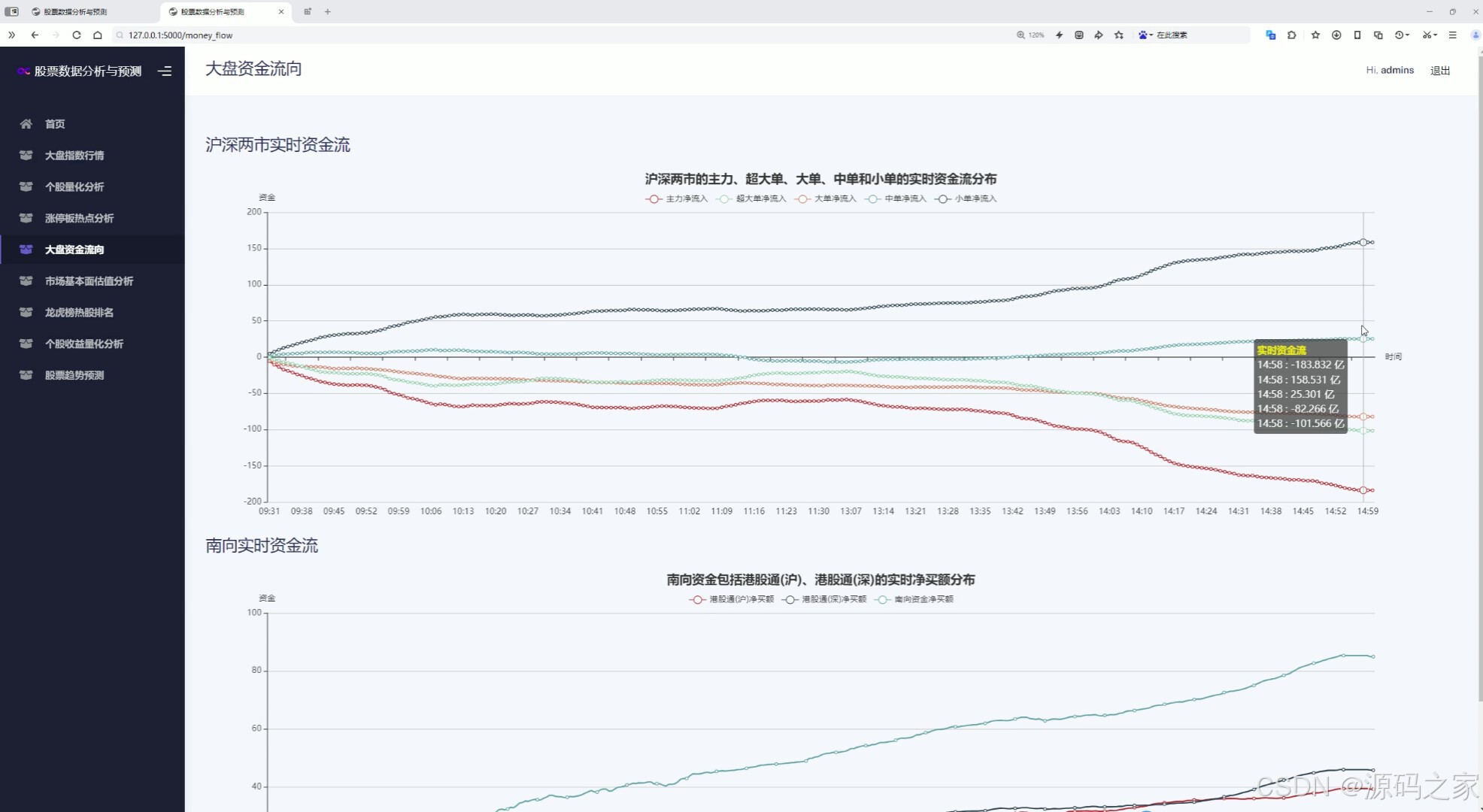 (5)大盘资金流向分析---沪深两市实时资金流向、南向实时资金流向