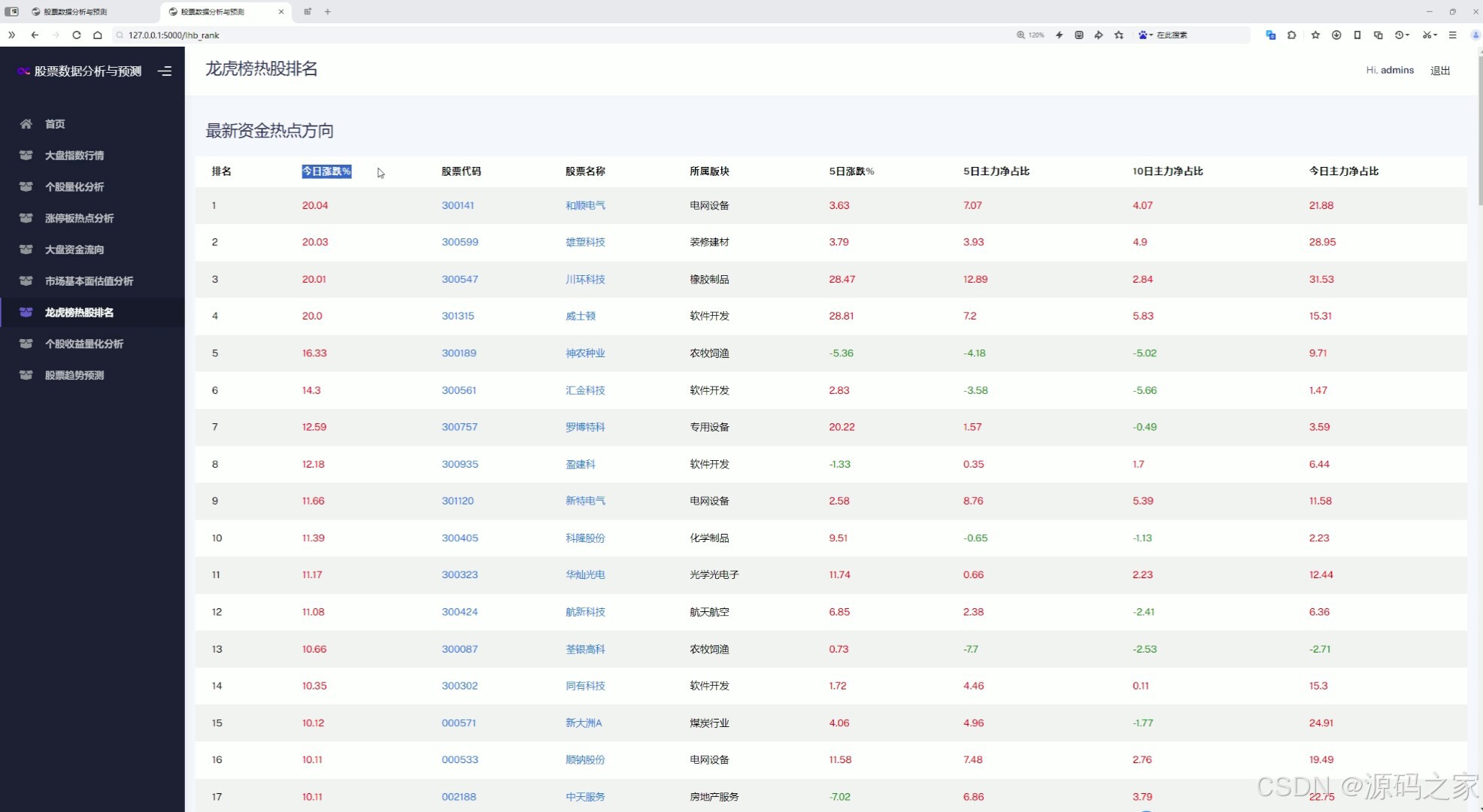该页面为龙虎榜热股排名模块,通过表格形式展示最新资金热点方向,包含个股排名、涨跌幅、股票代码、所属板块及多日主力资金占比等信息,便于用户快速了解市场热门个股及资金动向。