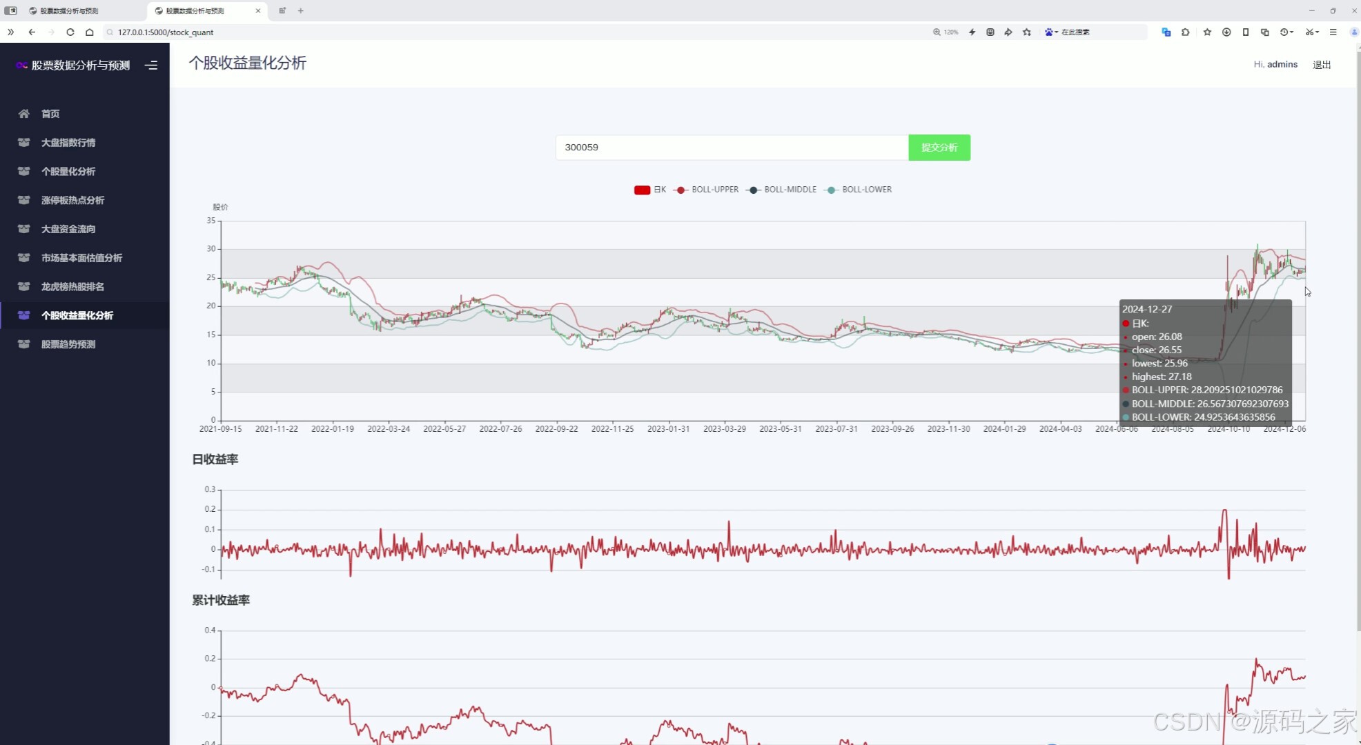 该页面是个股收益量化分析模块,可输入股票代码提交分析,图中包含叠加了布林带指标的日K线走势,以及日收益率和累计收益率的变化折线图,用于直观展示个股价格波动与收益情况。