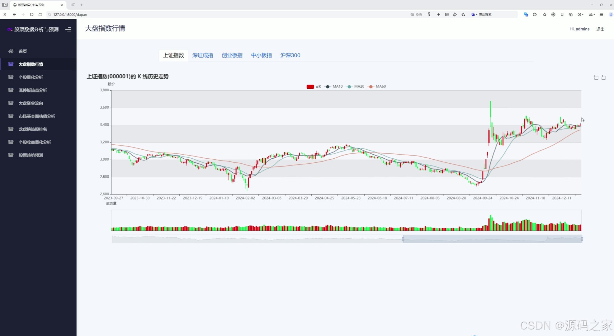 该页面是股票数据分析系统的大盘指数行情模块,可切换查看不同指数,图中展示了上证指数的日K线历史走势及成交量数据,并叠加了多条均线指标,直观呈现指数价格趋势与成交变化。