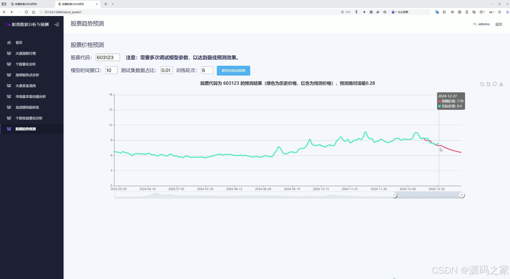 该页面是股票趋势预测模块,可设置股票代码及模型参数并提交训练预测,图中用不同颜色的折线分别展示个股的历史价格走势与预测价格走势,直观呈现模型对未来价格趋势的预测结果。