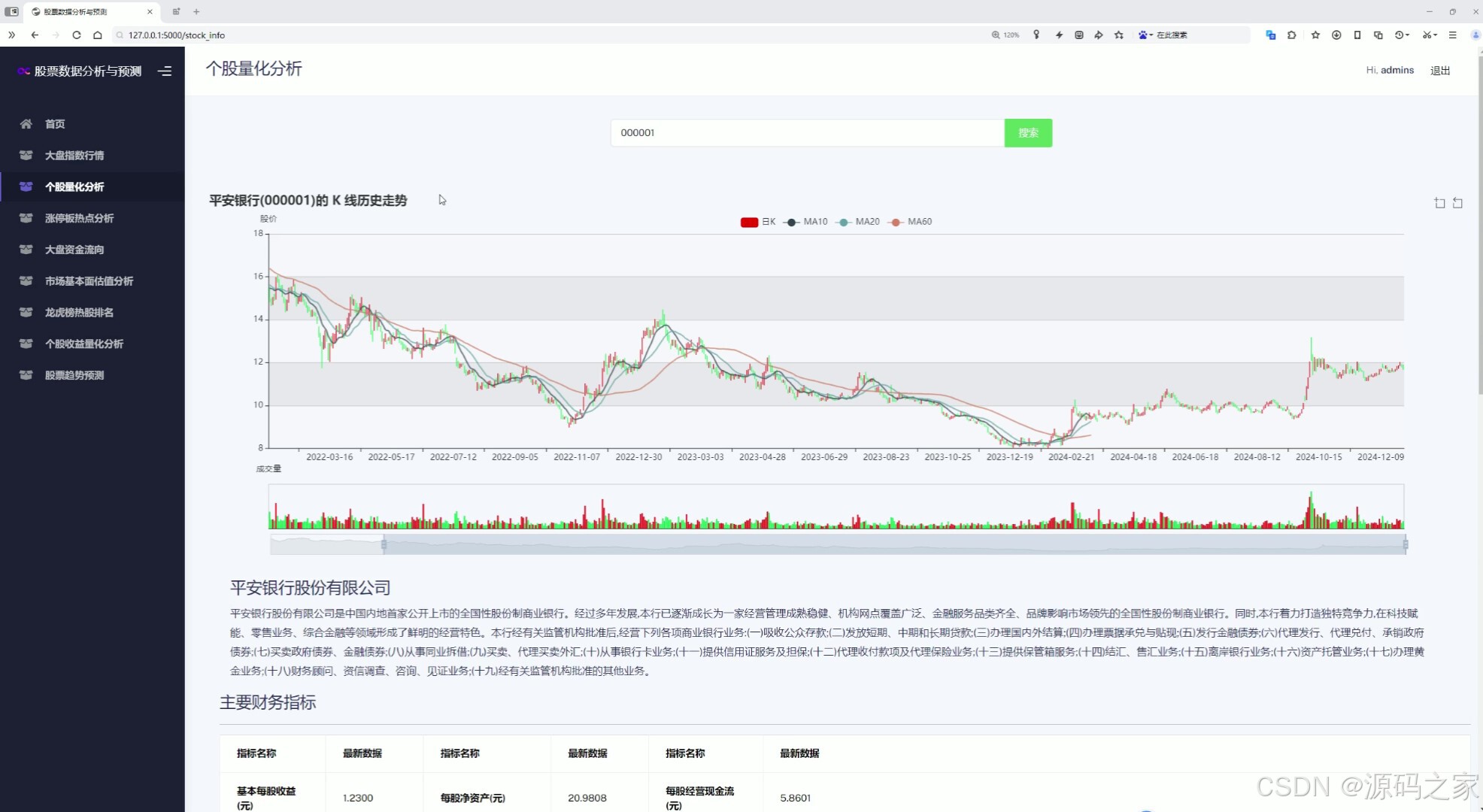 该页面为个股量化分析模块,支持股票代码搜索,图中展示了对应个股的日K线历史走势、均线指标与成交量数据,同时还包含公司简介及主要财务指标信息。