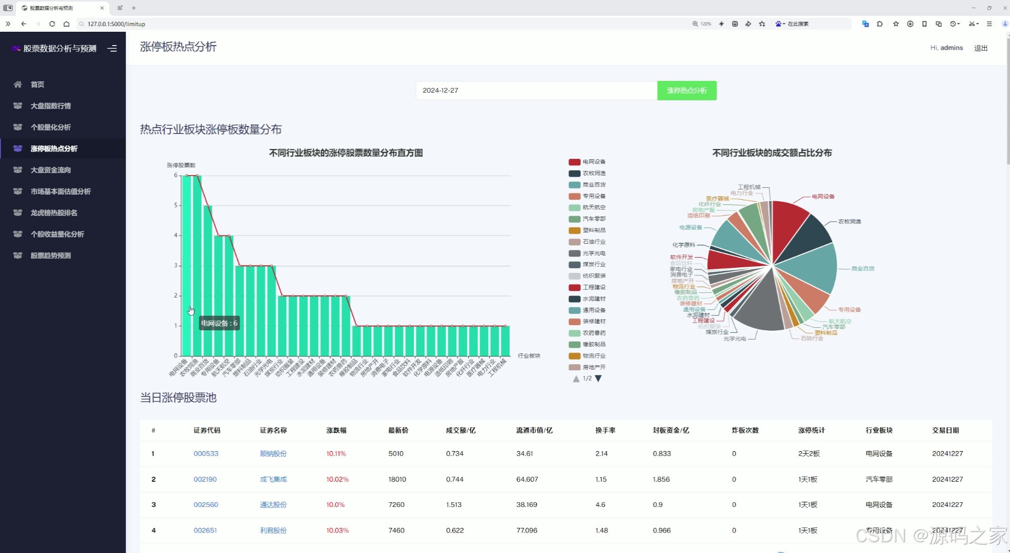 该页面为股票数据分析系统的涨停板热点分析模块,包含行业板块涨停股票数量分布直方图、不同行业板块成交额占比饼图,以及当日涨停股票信息表格,可按日期进行热点分析查询。