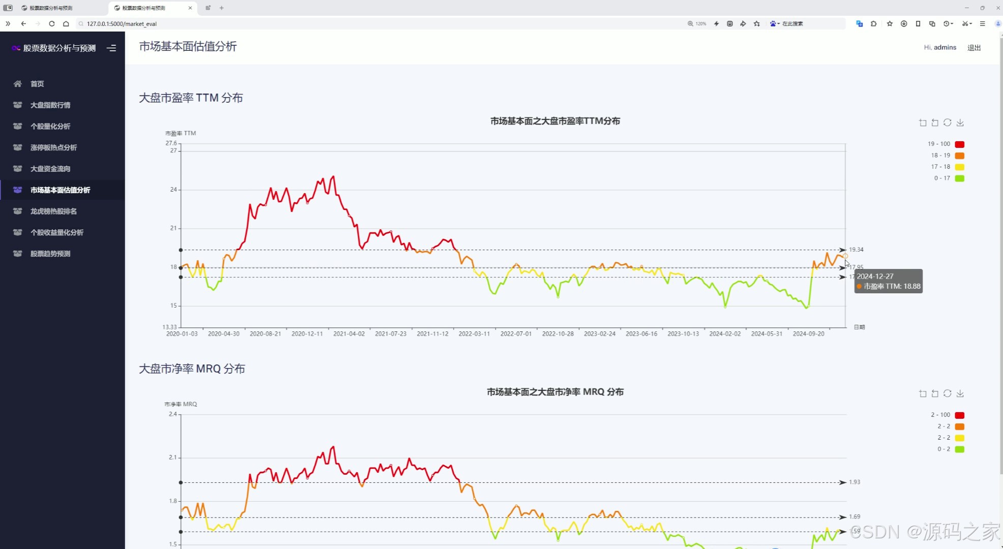 该页面是市场基本面估值分析模块,包含大盘市盈率TTM分布和市净率MRQ分布两张折线图,用不同颜色分段展示指标随时间的变化趋势,直观呈现市场整体估值水平的历史波动情况。