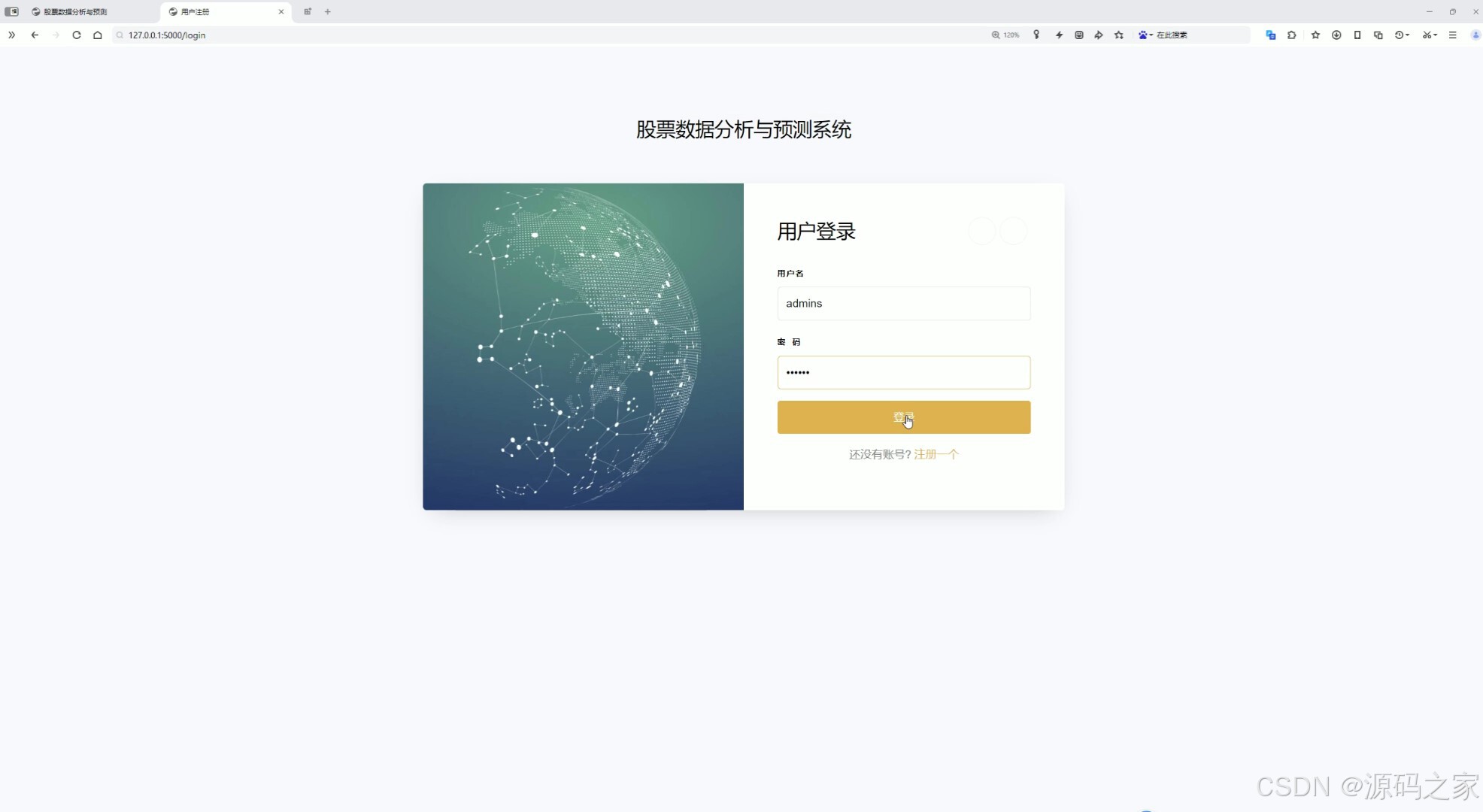 该页面是股票数据分析与预测系统的用户登录界面,提供用户名和密码输入框、登录按钮及注册入口,用户可通过输入账号密码完成身份验证以进入系统,保障数据与功能的访问权限。