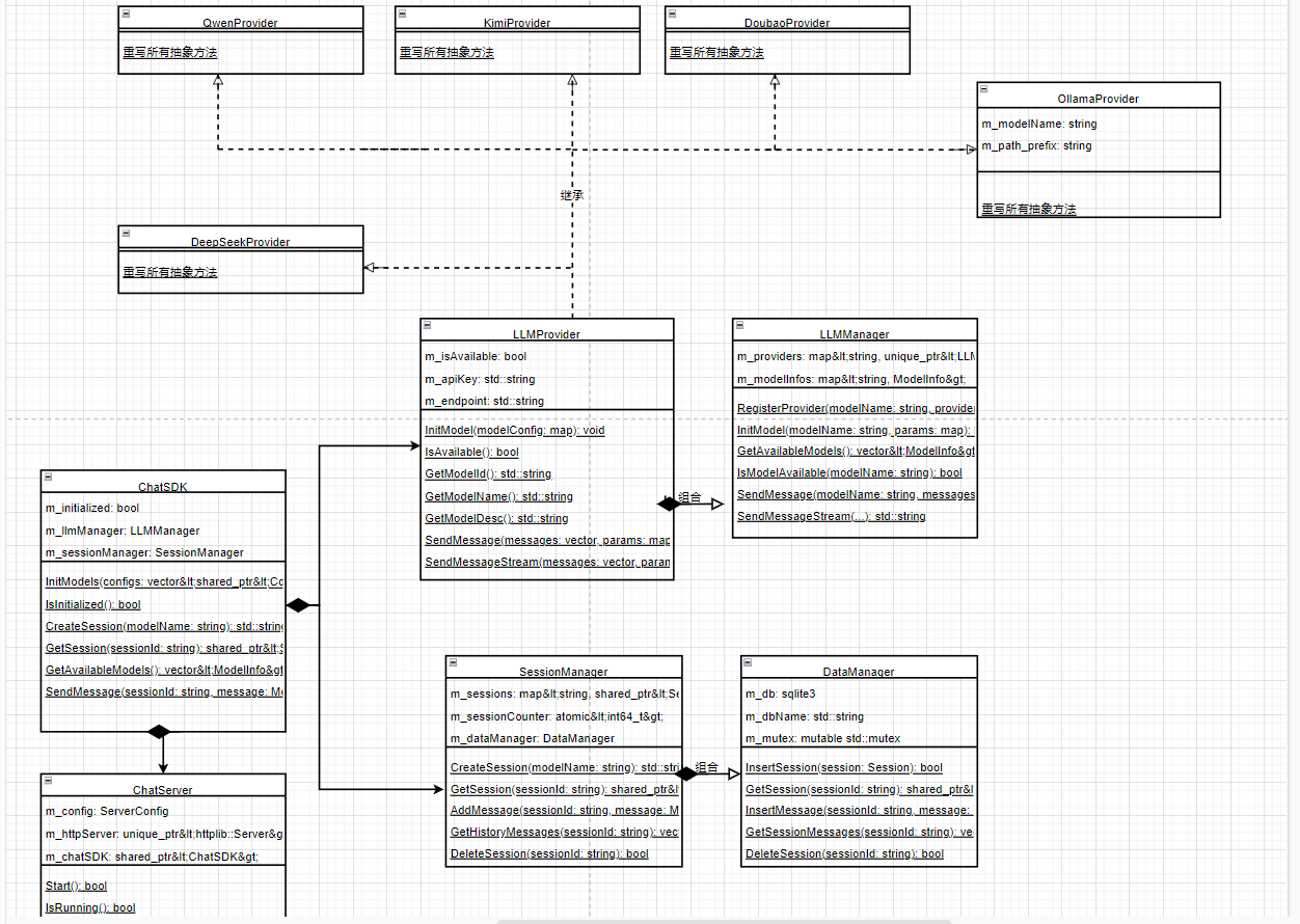 LLMManager:管理所有模型,统一调度SessionManager:管理聊天会话,保存历史记录ChatSDK:对外提供统一调用入口,封装所有核心功能