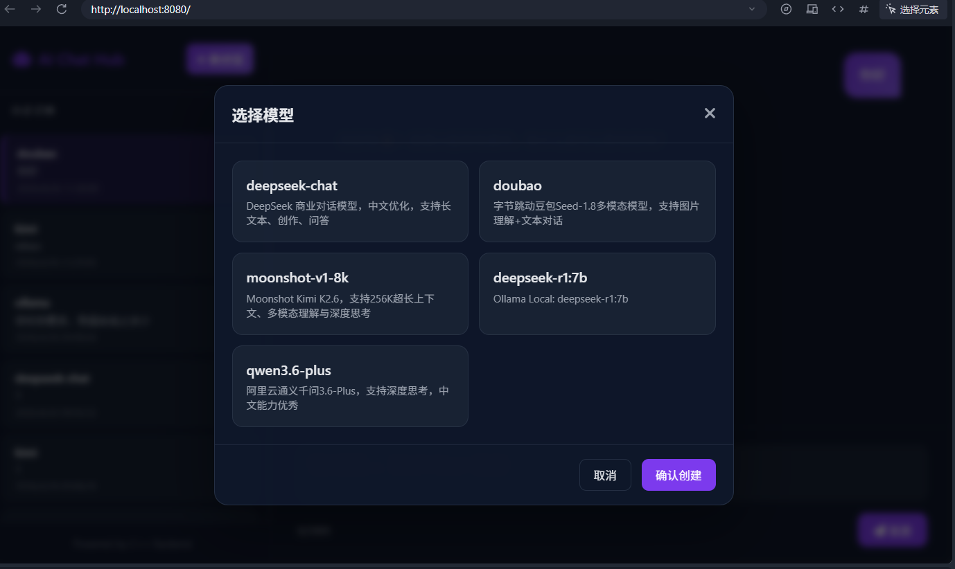 交互层:用户操作界面(聊天窗口、模型选择、会话管理)