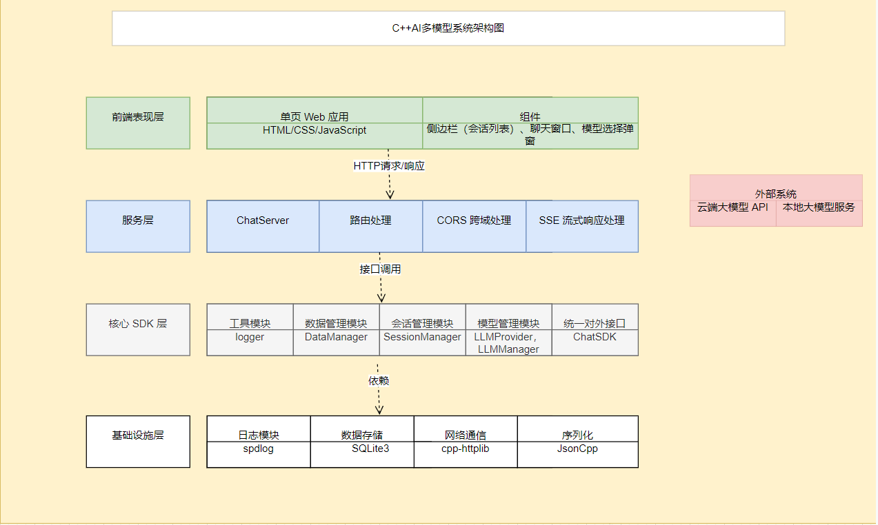 依赖层:底层工具库(网络、日志、数据库)+ 外部大模型(云端 / 本地)