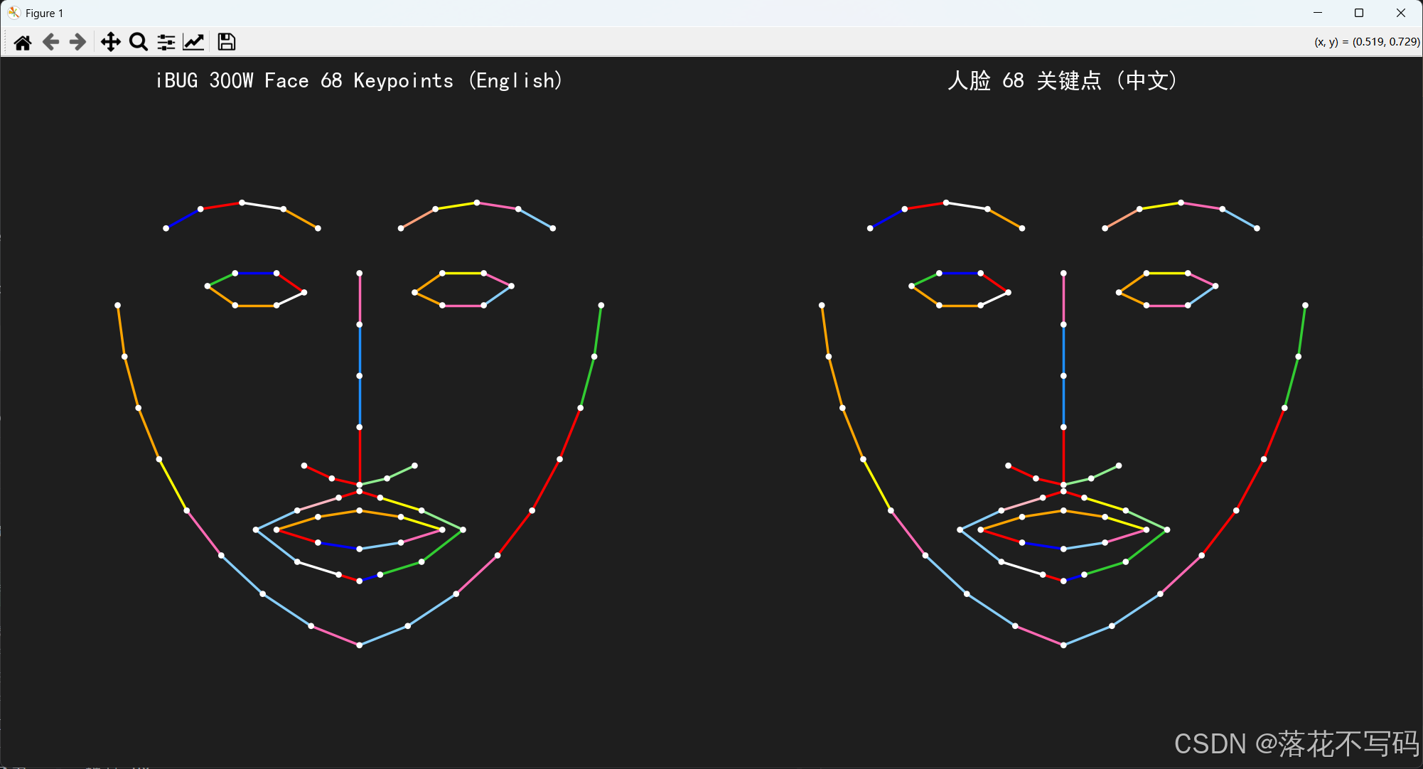| 27 ~ 35 | 鼻子 | Nose | 9个点,其中27-30为鼻梁,31-35为鼻翼底部的U形 |