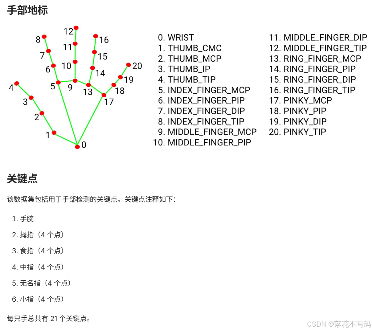 | 5, 6, 7, 8 | 食指关节 | Index Finger (MCP, PIP, DIP, Tip) | 从指根关节到食指指尖的4个点 |