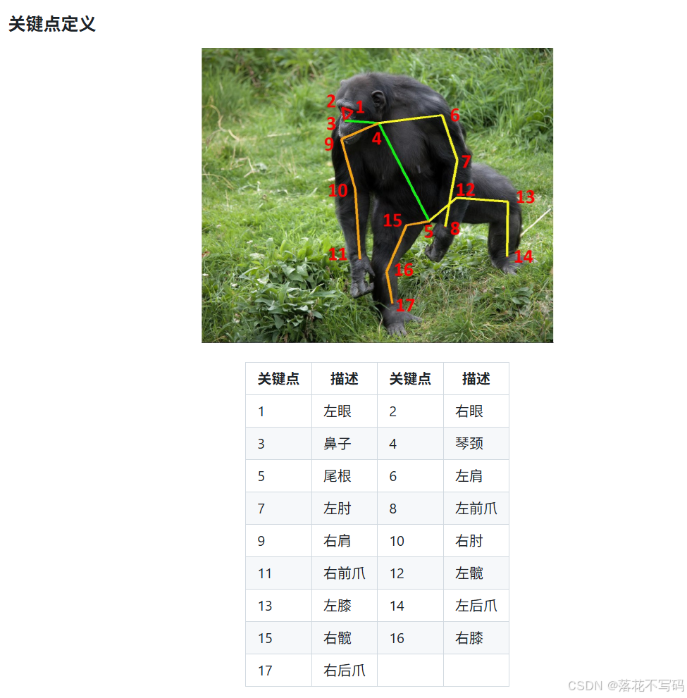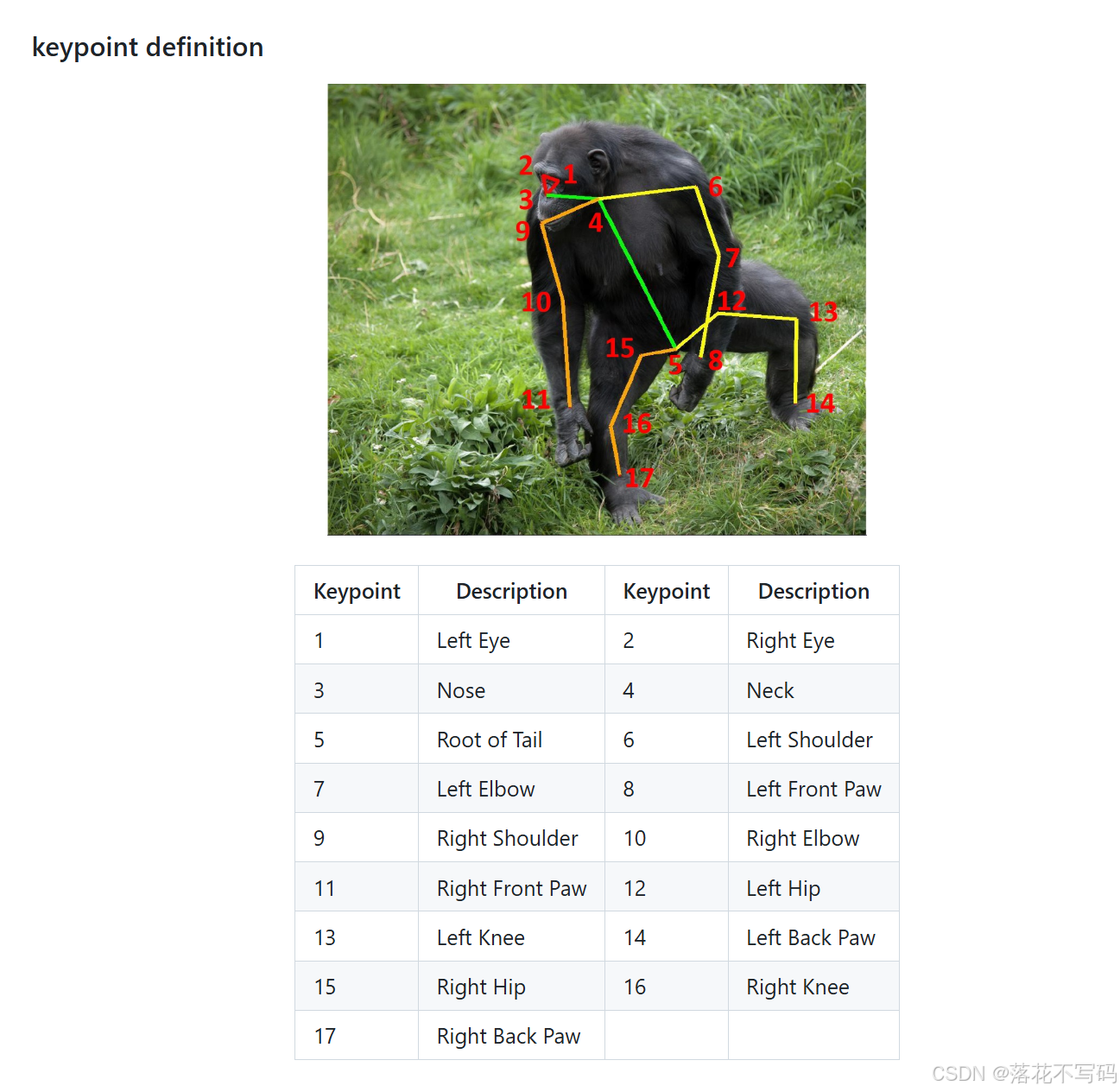 在学术界,标准的 AP-10K(泛哺乳动物姿态估计数据集)通常定义了 17个 关键点,也可能是 18 个关键点。通常第18个点增加的是"尾尖 Tail Tip")。