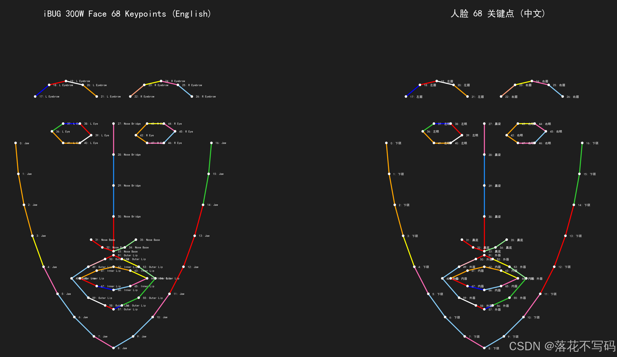 | 0 ~ 16 | 下颌与脸颊轮廓 | Jawline / Face Contour | 17个点,从左耳根沿着下巴画到右耳根的U型弧线 |