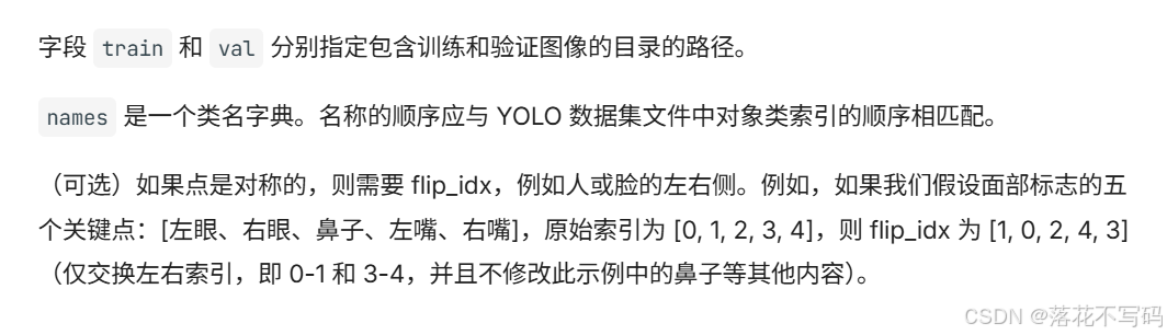 除了存放图片和 txt 标签的文件夹,还必须有一个 data.yaml 文件来告诉模型如何读取这些数据。YOLO官网的数据集配置文件如下(关键点检测任务):