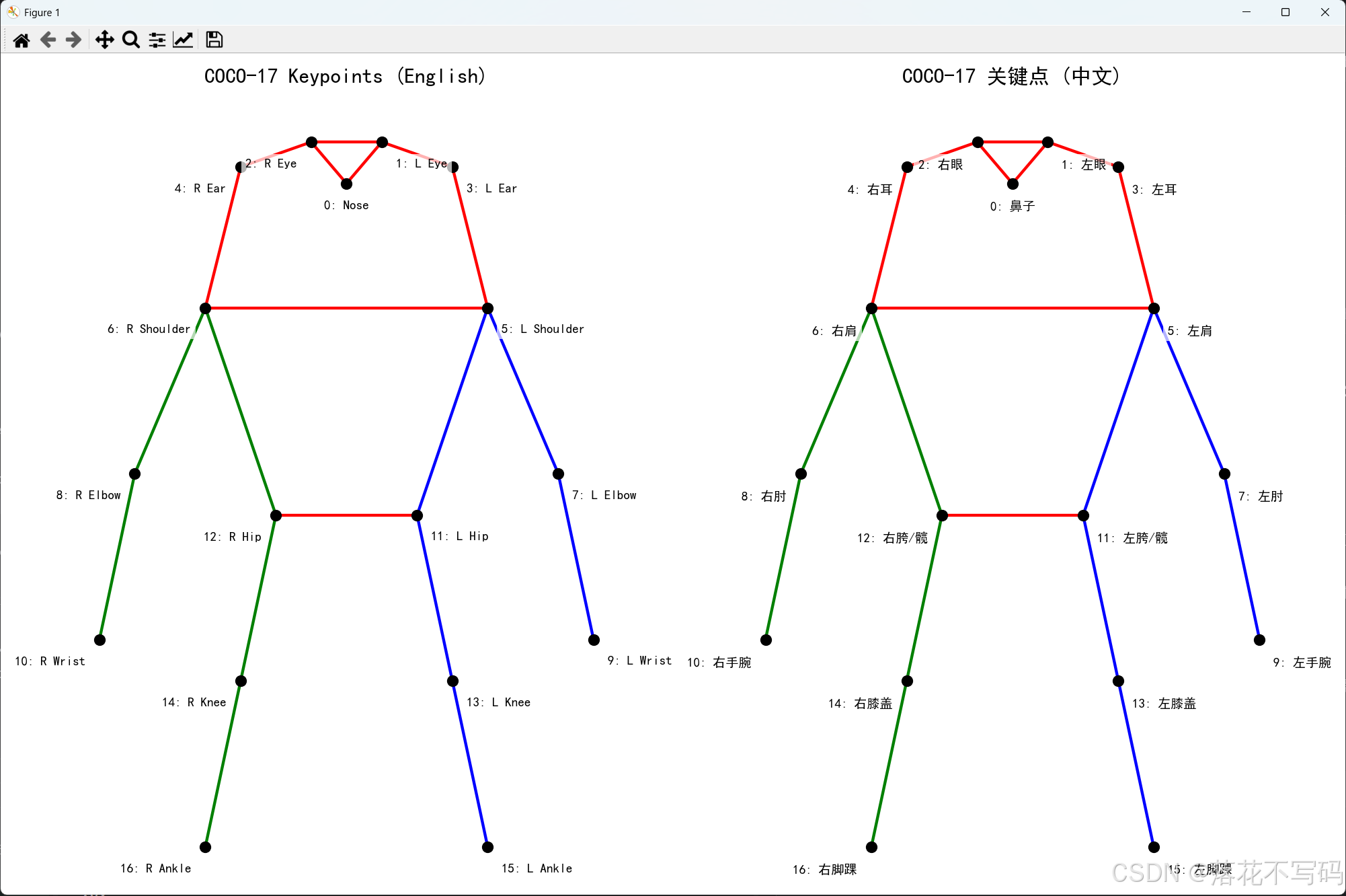 目前计算机视觉中最通用的人体姿态估计标准,包含 17 个关键点,主要涵盖五官和四肢关节。