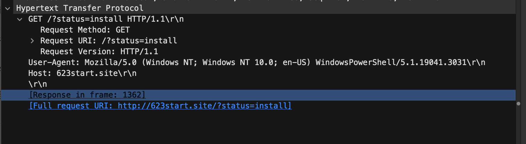 - WindowsPowerShell/5.1.19041.3031 在User- Agent中出现了,这说明该请求由PowerShell发出,而非普通浏览器请求访问