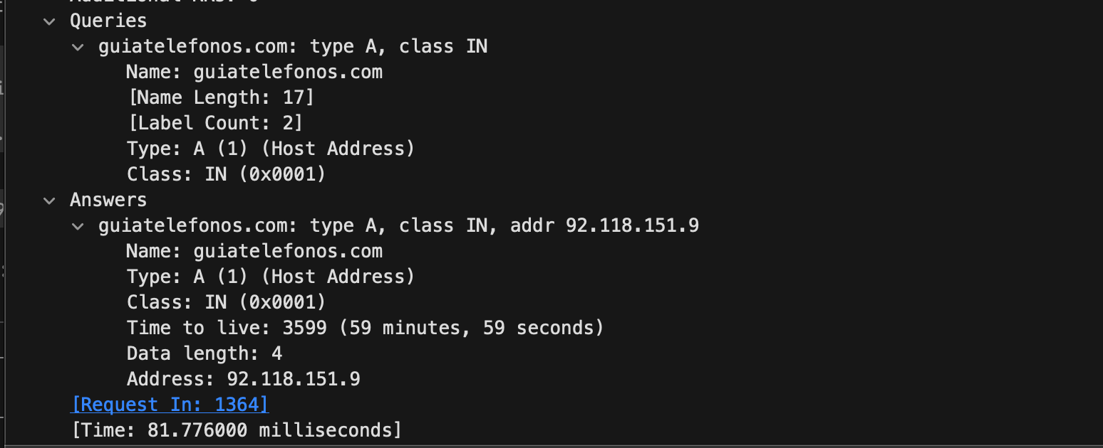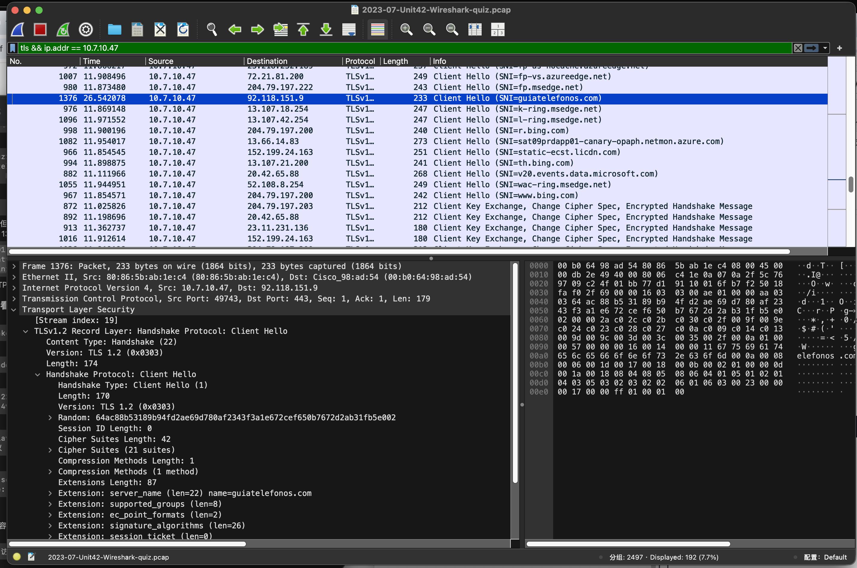 在第No.1376记录中,我们可以看到与guiatelefonos.com的TLS握手,这也明确描述了10.7.10.47 确实在 TLS 握手中声明自己要访问 guiatelefonos.com。