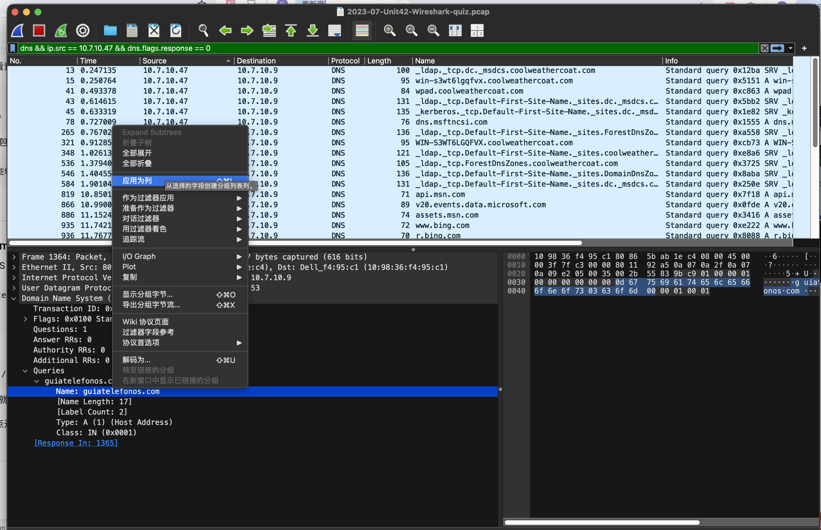 我们查看DNS包内,通过Queries字段,我们就可以看到每一条DNS查询的目标,这里选中查询字段下的Name字段右击,选择应用为列(Apply as Column),可以把这个字段加入到列表中,让我们快速审阅