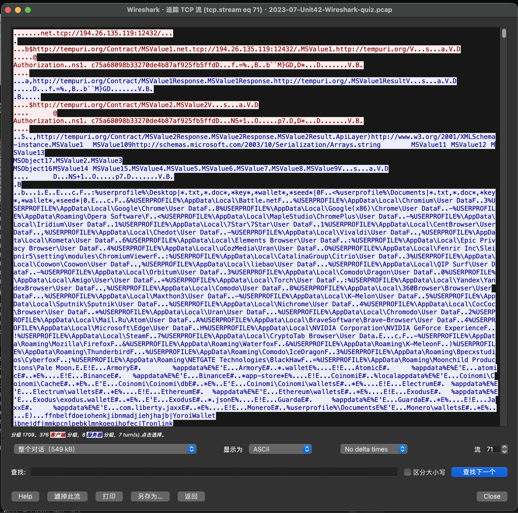 这里要注意,如果目标是一个标准的HTTPS流,那么我们依然无法得到任何信息,但是这条194.26.135.119:12432存在着大量的可读内容,说明它不是普通 HTTPS,或者至少其中存在可读的明文字段和结构。