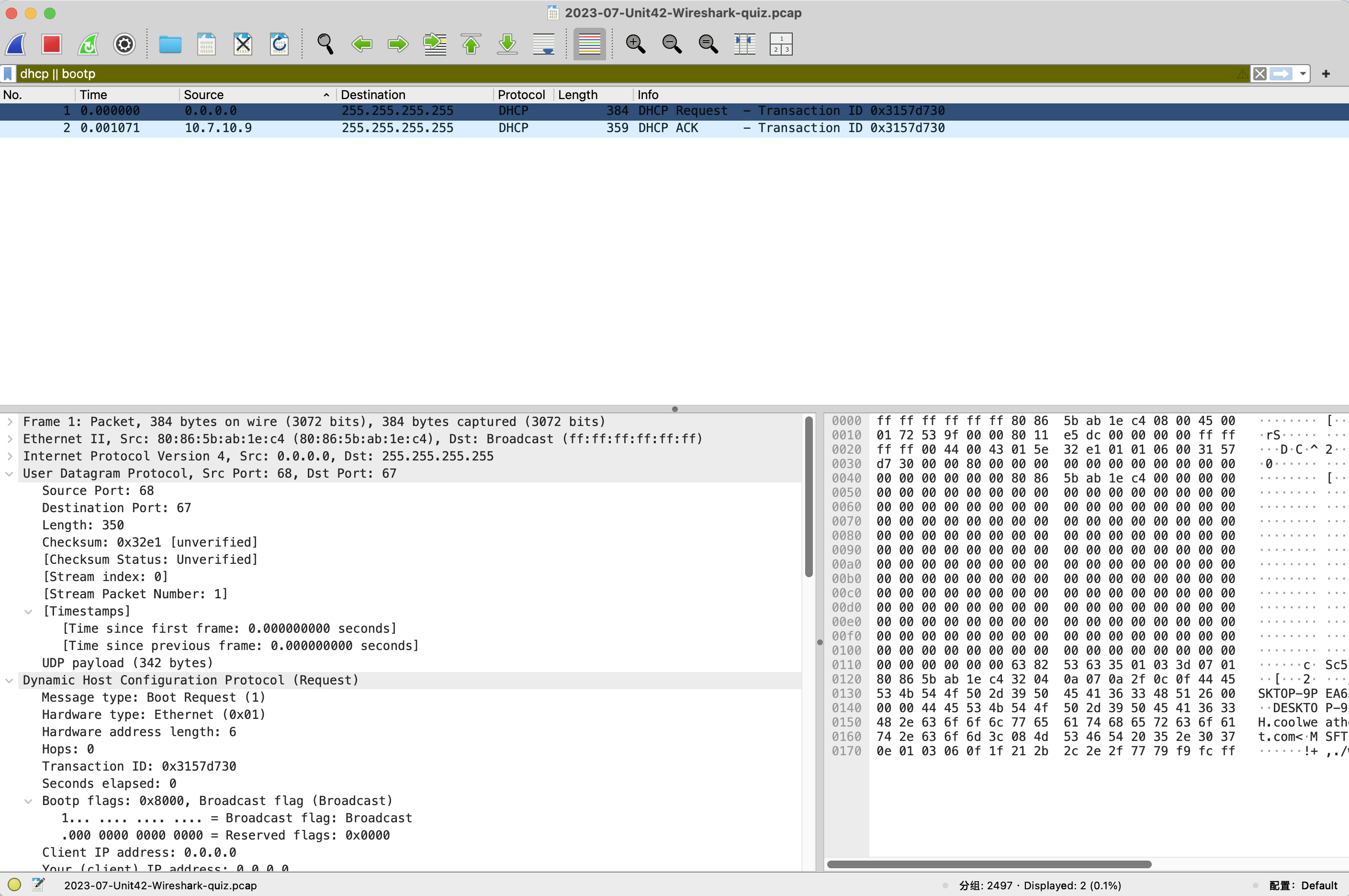 可以看到,我们得到了两条记录,这是一个标准的DHCP请求和DHCP响应的过程,那么根据之前的描述,我们得知:10.7.10.9是这个域的DHCP服务器,这两条记录本质描述了,当前这台主机被启动后,向服务器请求了DHCP,所以第一条记录中,可以看到源IP为0.0.0.0,这其实是DHCP初始阶段,而目标是255.255.255.255,这其实是由于当前初始阶段没有IP,只能通过广播的形式,向DHCP服务器传达请求信息,而第二条记录,可以看到服务器同样使用广播的方式将包发送给目标,其实到这里服务器已经得到目标的MAC地址以及目标的IP将会获得的IP信息,只是目标还未得到,所以这里的目标地址仍然是255.255.255.255,而且在寻址中DHCP流量使用包内的xid和目标MAC地址联合寻址。