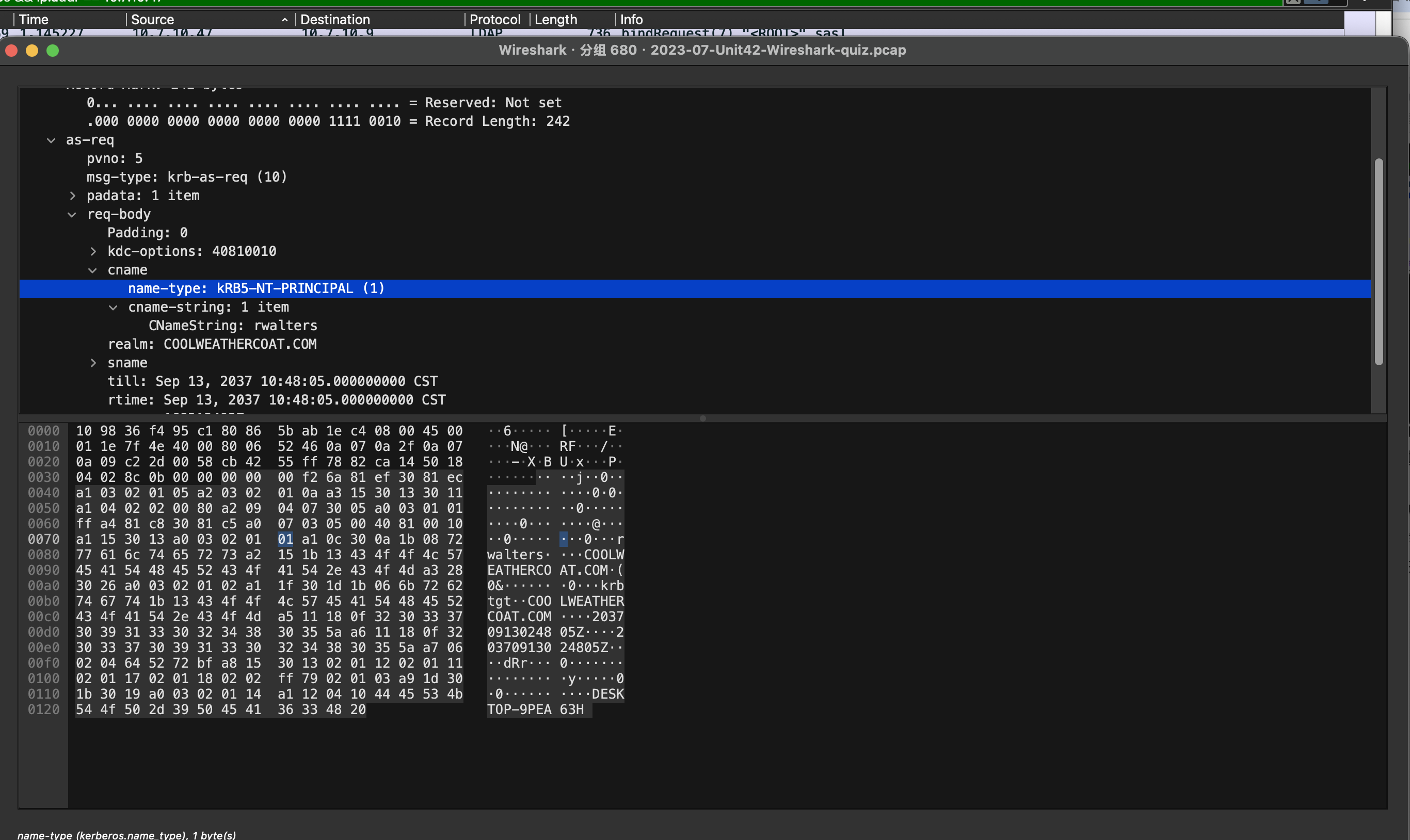 在 Windows 域环境中,用户身份经常会出现在 Kerberos、LDAP、SMB、NTLM 等协议里。这份流量里,Kerberos 是最直接的入口。