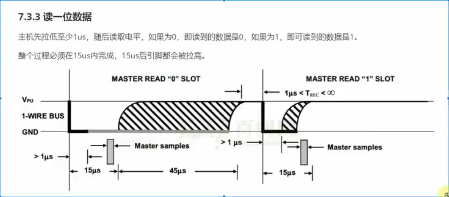 - 主机拉低至少 1µs,发起读时隙。
