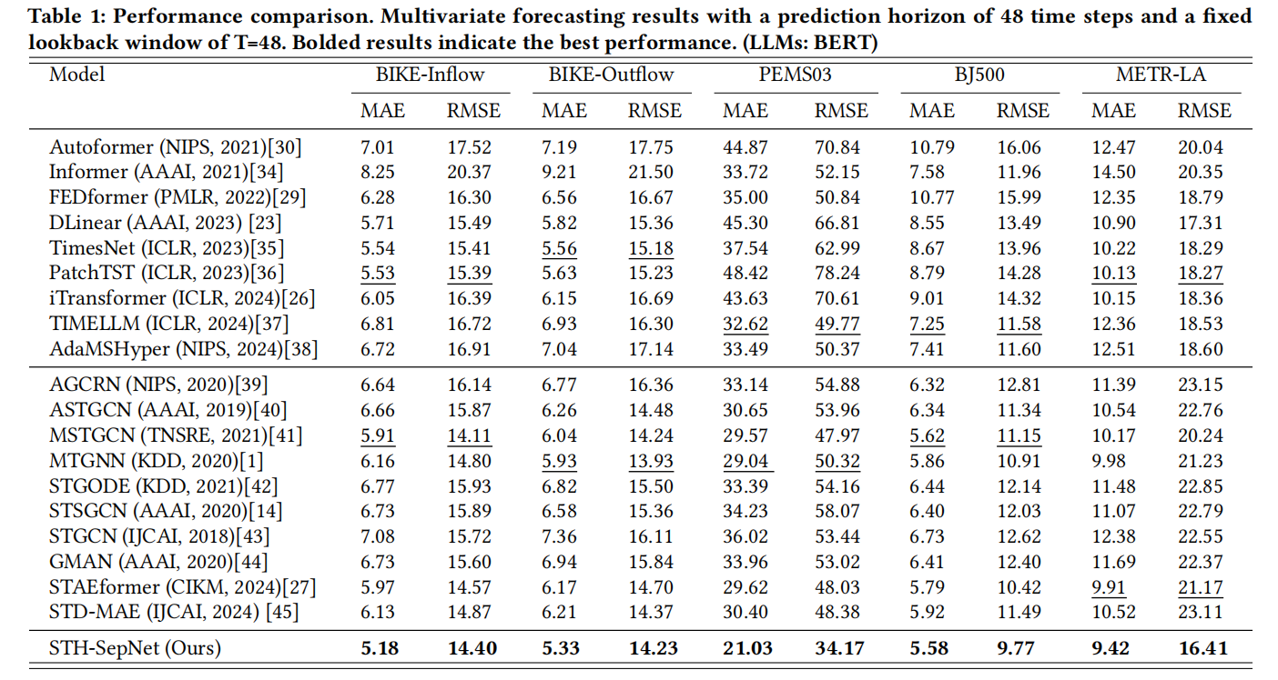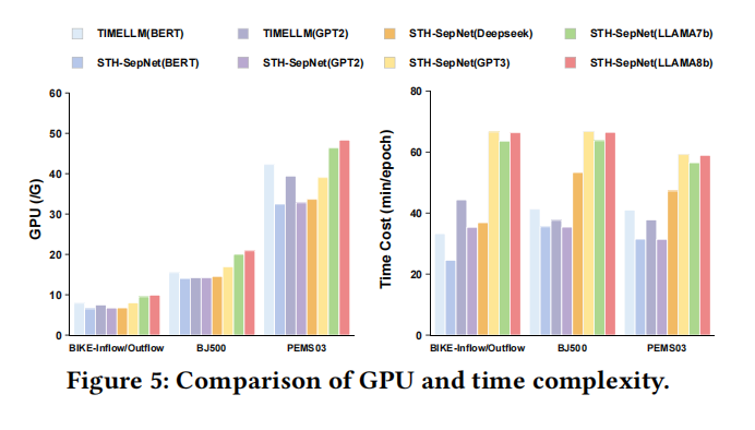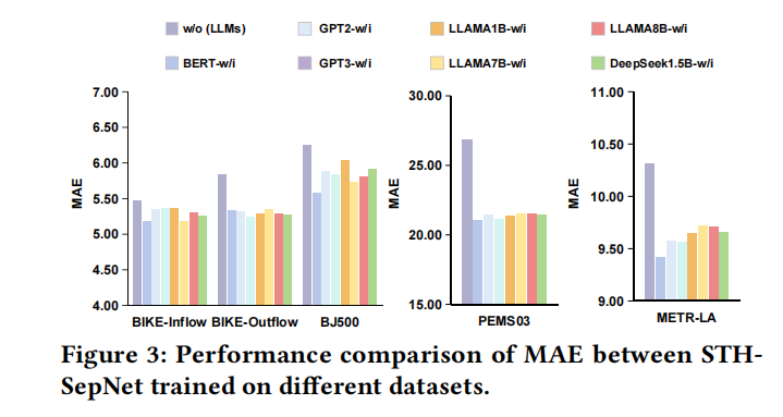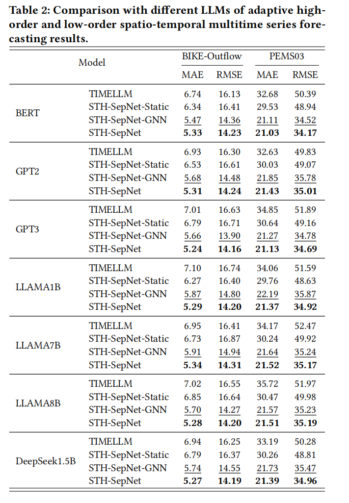 论文中提到,STH-SepNet 可以使用 BERT、GPT-2、LLAMA、DeepSeek 等不同预训练模型作为时间模块骨干。实验结果表明,BERT 这类轻量化模型已经可以取得较好的预测效果,而更大的 LLM 并不一定稳定提升性能。