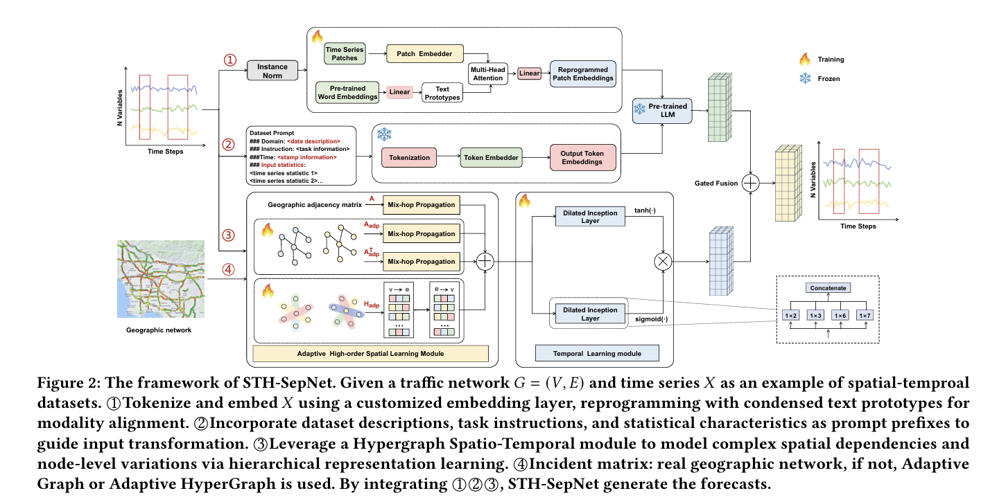 - 大模型不一定要包办所有任务。在时空预测中,LLM 更适合处理时间序列中的趋势、周期性和统计模式,而空间拓扑关系仍然需要图结构或超图结构来建模。STH-SepNet 的做法是让 LLM 做自己擅长的部分,而不是让它直接承担整个时空预测任务。