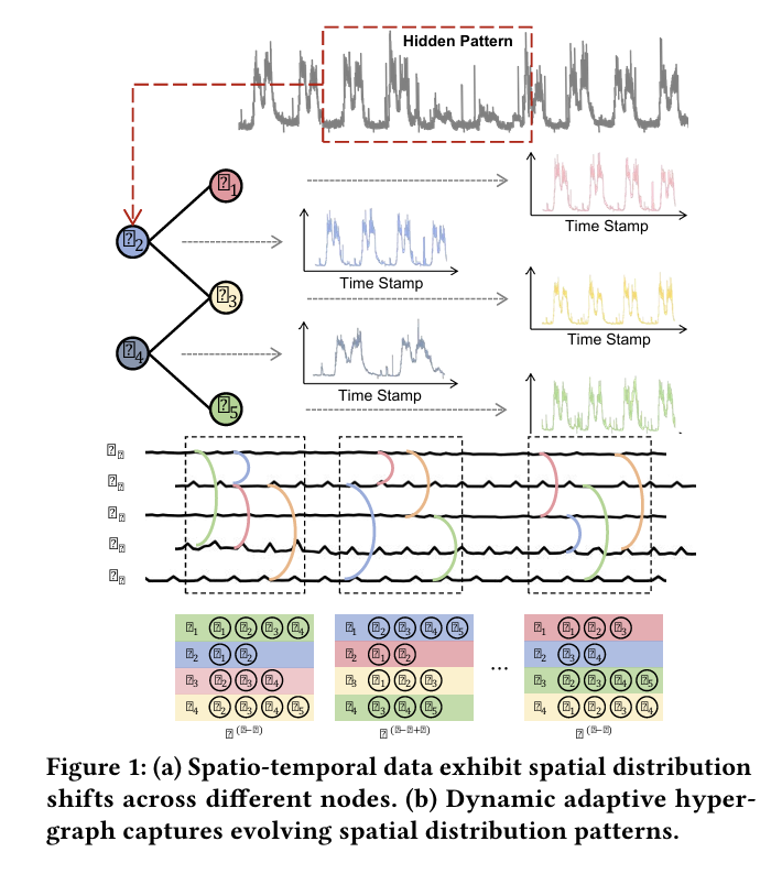 - 用自适应超图处理空间依赖。传统图神经网络主要建模两两节点关系,而超图可以通过一条超边连接多个节点,更适合描述交通网络、城市区域或共享单车系统中复杂的多节点联动关系。论文进一步通过动态构造超边,使模型能够适应不断变化的空间依赖。