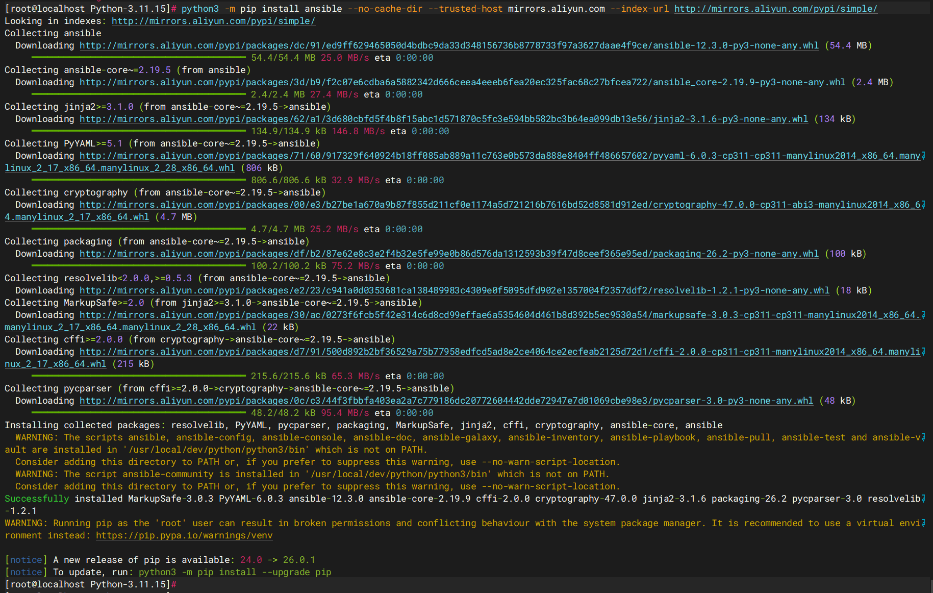 python3 -m pip install ansible --no-cache-dir --trusted-host mirrors.aliyun.com --index-url http://mirrors.aliyun.com/pypi/simple/