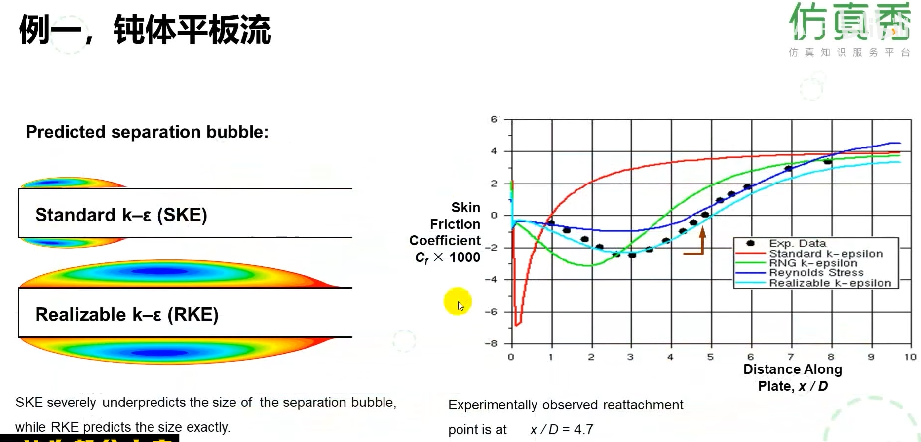 分离泡预测结果:标准k-ε模型(SKE)严重低估分离泡尺寸,而可实现的k-ε模型(RKE)能准确预测分离泡大小,显示其对逆压梯度和分离现象有更好的捕捉能力。