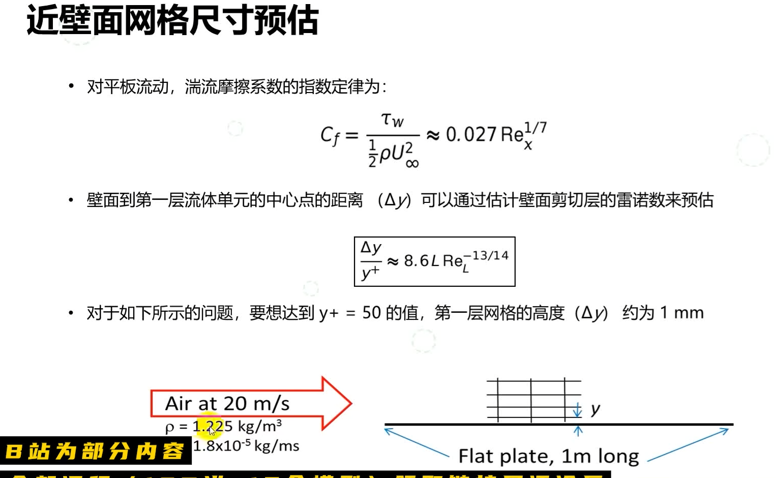 介绍了近壁面网格尺寸的理论预估方法,特别是针对平板流动的第一层网格高度计算。它首先给出了湍流摩擦系数的经验公式,并基于该公式推导出了从壁面到第一层网格中心距离的计算公式,该公式与壁面雷诺数密切相关。通过一个具体的工程实例进行演示,在已知空气流速、密度、粘度和平板长度的条件下,计算得出若要达到目标无量纲距离y+为50,第一层网格的高度应设定为约1毫米。这为准确定义前处理中的边界层网格提供了直接的理论依据和实用计算手段。