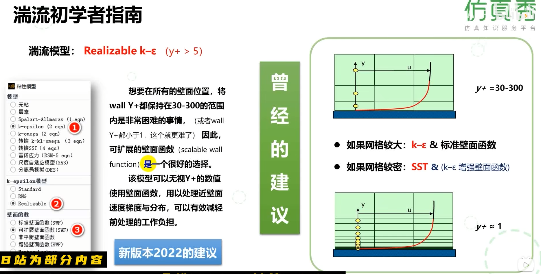 。针对Realizable k-ε模型,指出在所有壁面位置保持wall Y+在30-300范围内较困难,因此推荐使用可扩展壁面函数(scalable wall function),该模型可无视Y+数值直接处理近壁面速度梯度,减轻前处理负担。根据网格疏密给出曾经的建议:网格较大时采用k-ε配合标准壁面函数(对应y+约30-300的对数律区域),网格较密时采用SST配合k-ε增强壁面函数(对应y+≈1的粘性底层)。图中还展示了软件界面中湍流模型的层级选择路径,以及新旧版本建议的对比提示。