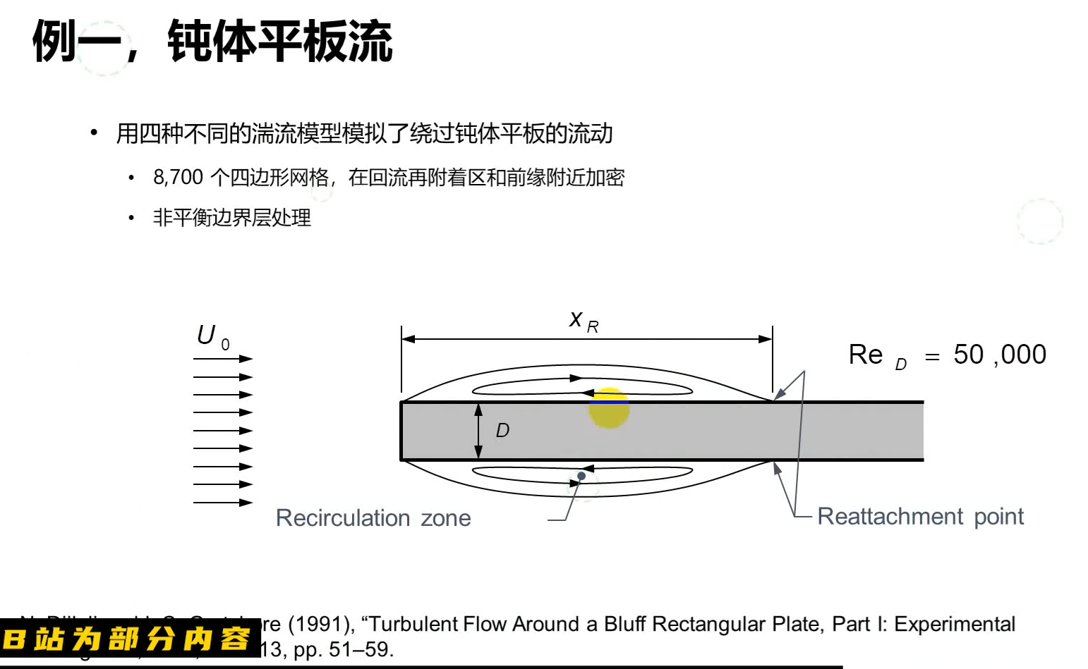 案例设置:采用四种不同湍流模型进行模拟,划分8700个四边形网格,在回流再附着区和前缘附近局部加密,并采用非平衡边界层处理;来流雷诺数Re_D=50,000,研究对象为矩形钝体平板绕流,关注其尾部分离泡与再附现象。