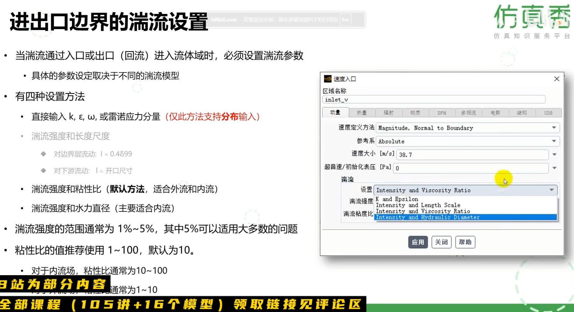 梳理了进出口湍流参数的设置逻辑、选项与推荐值,为仿真前处理提供了明确的操作指导。