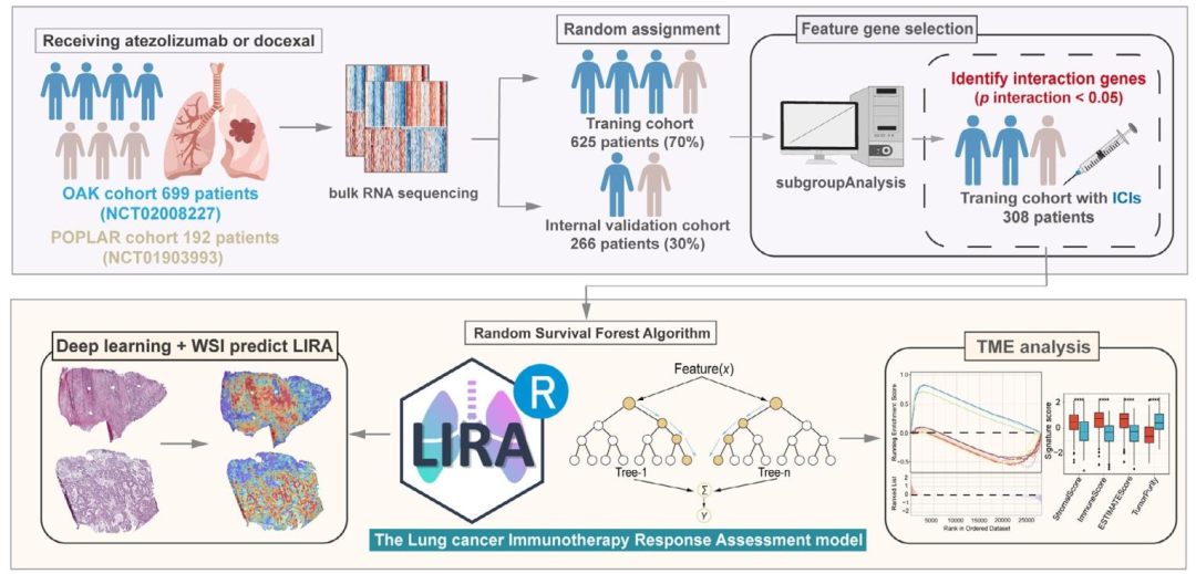 本研究的设计具有清晰的三层目的 。第一层(临床层) :开发一个基于转录组数据的机器学习模型,命名为LIRA(肺癌免疫治疗反应评估) ,用于预测接受ICI治疗的晚期NSCLC患者的生存获益(无进展生存期和总生存期) ,并在多个独立的多中心随机对照试验(POPLAR、OAK、ORIENT‑11)及真实世界队列中进行严格验证。第二层(技术层) :通过随机生存森林算法 和严格的特征筛选流程(单因素Cox回归、治疗交互作用分析、变量重要性排序),从海量基因中选出50个与免疫治疗结局最相关的模型基因,并计算每位患者的LIRA评分;同时建立单样本预测参考数据库 ,使模型具备个体化临床应用能力。第三层(生物学层) :这也是本研究区别于大多数纯预测模型的核心创新------揭示LIRA评分背后的生物学机制 ,即解释"为什么高LIRA评分患者对ICI响应好,而低LIRA评分患者容易耐药"。通过差异表达分析、通路富集、配体-受体互作、单细胞转录组测序以及基于深度学习的病理全切片图像分析,将LIRA评分与免疫细胞浸润、乙酰化/去乙酰化修饰、LRP8-APOE信号轴、Treg比例及肿瘤-成纤维细胞互作等具体生物学过程挂钩,从而为模型的预测能力提供坚实的机制支撑。