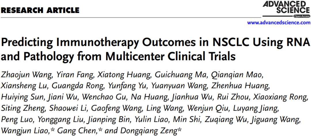 参考文献:Wang Z, Fang Y, Huang X, Ma G, Mao Q, Lu X, Rong G, Yu Y, Wang Y, Huang Z, Sun H, Wu J, Gu W, Huang N, Wu J, Zhou R, Rong X, Zheng S, Li S, Wang G, Wang L, Qiu W, Jiang L, Luo P, Liu Y, Bin J, Liao Y, Shi M, Wu Z, Wang J, Liao W, Chen G, Zeng D. Predicting Immunotherapy Outcomes in NSCLC Using RNA and Pathology from Multicenter Clinical Trials. Adv Sci (Weinh). 2026 Jan;13(3):e02037. doi: 10.1002/advs.202502037.