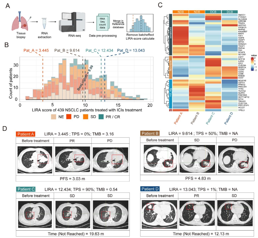 利用OAK和POPLAR中439例atezolizumab治疗样本建立参考数据库,可对单个新样本进行批次校正和LIRA评分计算。四个案例验证显示,LIRA成功识别出PD‑L1阴性但仍获益的患者及PD‑L1高表达却无效的患者。