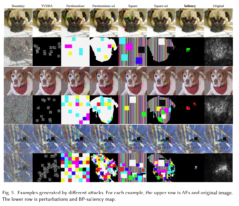 一些示例如图 5 所示。我们很容易发现原始 Parsimonious 攻击和方形攻击的扰动由于全局扰动在整个图像中非常明显,而它们的修改版本相对更不可感知,因为背景区域没有扰动。然而,它们的扰动仍然复杂且不规则,几乎占据了整个显著性区域。相比之下,即使限制在相同的显著性区域内,显著性攻击生成的扰动更小且更关键,大致对应于 BP-显著图中的亮像素。它们进一步代表了狗的鼻子或耳朵的位置,这与我们之前的灵感一致。此外,边界攻击的 AE 由于查询预算不足而包含明显的粗糙纹理,而 TVDBA 产生类似的不规则全局扰动。