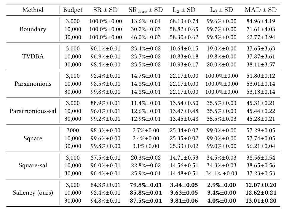 据我们所知,在黑盒设置中制作 AE 时,我们是第一个将扰动限制在显著性区域的方法。该方法易于与许多现有黑盒攻击兼容,并能显著提高其不可感知性,而成功率下降很小。我们提出了显著性攻击,一种新颖的无梯度黑盒攻击,它迭代地细化显著性区域内的扰动,使其保持最小且关键。与 SOTA 黑盒攻击相比,我们的方法在大多数明显失真(MAD)、L0L_{0}L0 和 L2L_{2}L2 距离方面实现了更好的攻击不可感知性,并且在基于人类感知阈值的 MAD 上获得了显著更高的成功率。我们证明了显著性攻击生成的扰动对基于检测的防御(包括特征压缩和二分类器检测)更鲁棒。