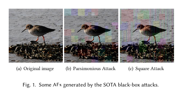 由于许多现实世界的在线应用编程接口(API)通常对用户查询施加强制的时间或金钱限制 [15],近期大多数关于黑盒攻击的研究关注提高查询效率,这确实取得了显著进展。例如,最先进的(SOTA)方形攻击 [2] 可以在 ImageNet 数据集 [9] 上平均仅用几十次查询就能成功进行无目标攻击。另一方面,这种性能通常是通过对原始输入应用大区域甚至全局扰动(例如,方形攻击中的随机垂直条纹)来实现的,最终导致生成的 AE 与原始图像存在显著的视觉差异(参见图 1 中的一些示例)。实际上,不可感知性对于攻击者至关重要。当前在线 API 通常将检测器集成到其服务中以检测异常输入 [19]。那些扰动过于明显的 AE 难以通过这些检测器,更不用说人类判断了,这阻碍了这些黑盒攻击的实际应用。