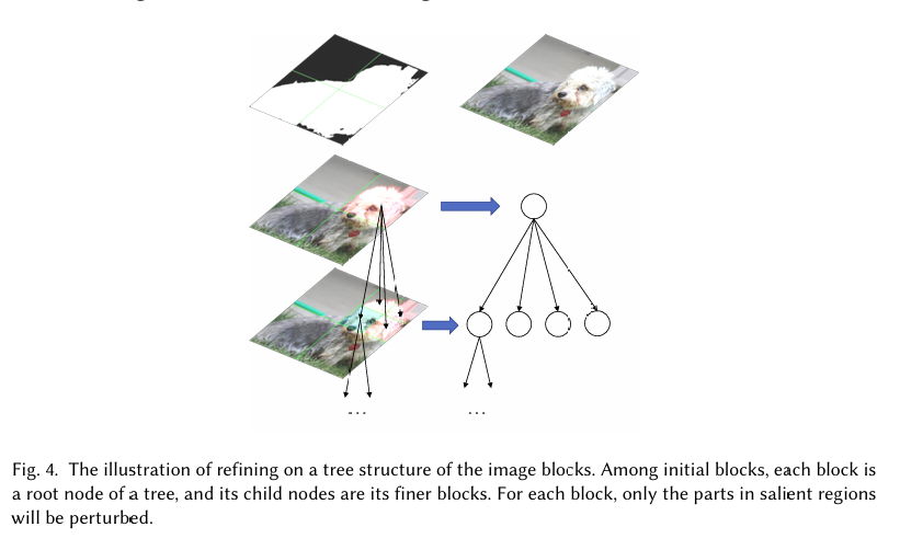 为了实现更不可感知的攻击,我们随后寻求进一步将扰动限制在更小的区域。直觉是,即使在显著性区域内,某些子区域更为关键。例如,已有研究表明,狗的面部区域是狗图像显著性区域中最亮的部分 [46],遮挡它将显著改变模型输出 [42]。此外,通过将内部特征可视化与输出预测相结合,[25] 揭示在狗的面部区域内,耳朵和眼睛似乎比其他部分更重要。因此,有理由假设图像的显著性区域相对于其对模型输出的影响是渐进的。如果我们能找到更小但更显著的子区域,扰动将更高效,从而导致更不可感知的攻击(参见图 2 第三列)。因此,我们提出了显著性攻击,一种新颖的黑盒攻击,它递归地细化显著性区域内的扰动。