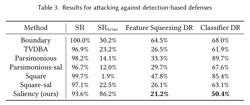 从表 3 可以看出,我们的显著性攻击在特征压缩和二分类器检测方面都比其他基线获得了更低的检测率。对于特征压缩,尽管显著性攻击生成的扰动区域很小,因此面临被压缩器去噪的更高风险,但由于我们有效的扰动,显著性攻击的检测率仍然优于其他攻击。对于二分类器检测器,我们的显著性攻击获得了接近 50%50\%50% 的准确率/检测率,这意味着扰动足够不可见,以至于分类器难以收敛,结果相当于随机猜测。因此,我们的显著性攻击能够生成不可感知的 AE,逃避不同的基于检测的防御。
