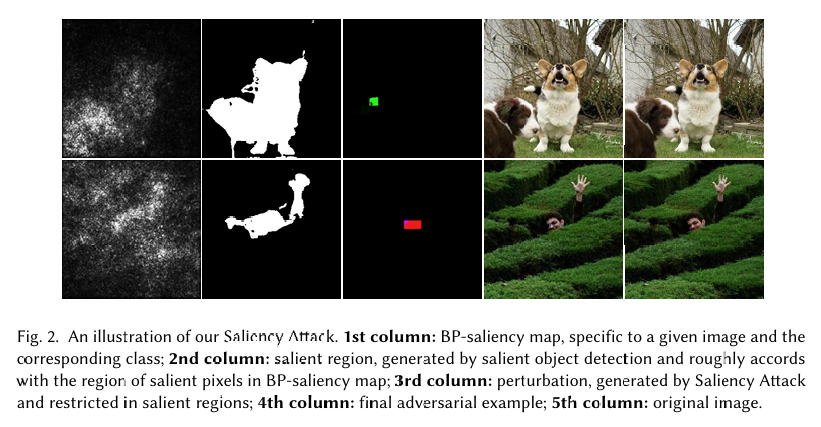 如前所述,已有白盒攻击或基于迁移的攻击将扰动限制在小显著性区域内。具体地,白盒攻击 JSMA [26] 通过计算模型输出相对于输入像素的导数来构建 BP-显著图 [32],而两个基于迁移的攻击 [10, 40] 分别利用 CAM 和 Grad-CAM 提取显著性区域。CAM [46] 用卷积层和全局平均池化替换 CNN 最后的全连接层,并通过前向传播定位类别特定的显著性区域。Grad-CAM [30] 改进了 CAM,无需修改网络架构,但仍需要访问模型内部参数以计算梯度。因此,CAM 和 Grad-CAM 只能应用于白盒攻击或基于迁移的攻击,后者首先构建一个透明的替代模型,用基于梯度的白盒攻击制作 AE,然后将生成的 AE 迁移到目标模型。可以想象,对于基于迁移的攻击,AE 和显著图的可迁移性高度依赖于替代模型与目标模型之间的相似性,这进一步依赖于训练数据分布的先验知识。不幸的是,在黑盒设置中,这些知识和模型梯度都是不可用的。考虑到上述方法的局限性,我们采用显著性目标检测模型 [44] 来直接根据输入图像生成显著图,无需访问目标模型的架构或参数。