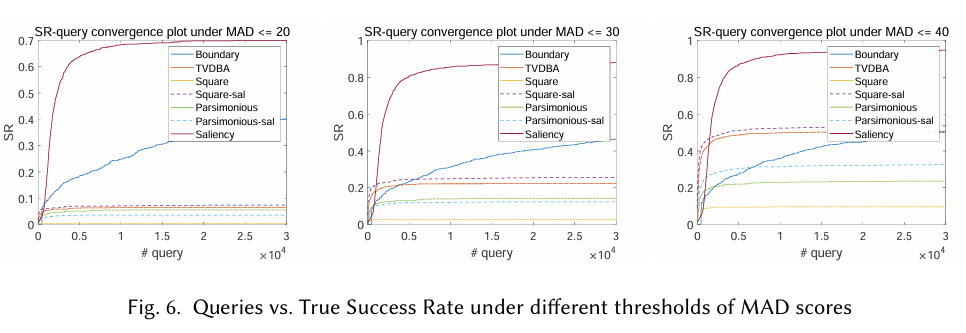 我们还在图 6 中绘制了在不同 MAD 阈值下 SRtrue\mathrm{SR}{\mathrm{true}}SRtrue 随查询次数的收敛曲线。它表明显著性攻击在大多数时候能稳定地领先其他攻击。对于一些基线,如方形攻击和 Parsimonious 攻击,由于全局扰动和一些技巧(如用随机垂直条纹初始化扰动 [2]),它们可以用很少的查询生成一些成功的 AE,但它们缺乏进一步提高不可感知性的能力。相反,显著性攻击保守地选择小区域进行扰动,因此其查询效率在开始时略低于某些基线,但很快超过它们。我们观察到,随着查询次数的增加,显著性攻击的 SRtrue\mathrm{SR}{\mathrm{true}}SRtrue 稳定增长,这意味着它可以不断细化扰动以更好地满足不可感知性约束。而对于其他攻击,SRtrue\mathrm{SR}_{\mathrm{true}}SRtrue 几乎收敛到一定水平。