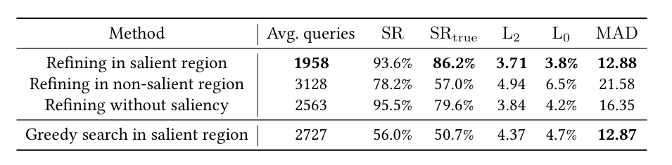 为了验证显著性区域和细化搜索的有效性,我们进行了消融研究,结果如表 2 所示。其中,"Greedy" 表示在显著性区域内使用贪心搜索(即没有递归细化),而"Saliency (ours)" 是完整的显著性攻击。我们观察到,与显著性攻击相比,贪心搜索在所有查询预算下都实现了更高的 SR,但以不可感知性为代价。例如,在 3,000 次查询时,贪心搜索的 SR 为 88.1%,而 SR\textsubscript{true} 仅为 79.8%(显著性攻击为 84.3%)。此外,贪心搜索的 L2L_{2}L2 和 MAD 值显著更高。这表明递归细化对于实现高不可感知性至关重要。此外,我们还比较了"Saliency (ours)" 与"Saliency (no saliency)",后者是显著性攻击的变体,但扰动不限制在显著性区域内(即在整个图像上搜索)。结果显示,没有显著性区域的限制,SR 略有提高,但不可感知性显著恶化。这证实了将扰动限制在显著性区域的有效性。