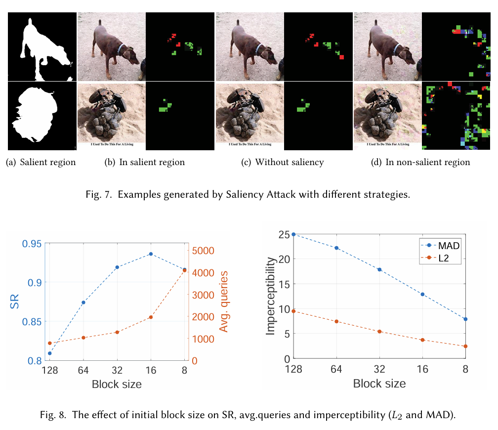 我们研究了初始块大小 kintk_{int}kint 对显著性攻击性能的影响。我们在图 8 中绘制了不同 kintk_{int}kint 下的 SR、平均查询次数和不可感知性指标。结果表明,较小的 kintk_{int}kint 导致更高的不可感知性(更低的 L2L_{2}L2 和 MAD),但 SR 略有下降且查询次数增加。这是因为较小的块允许更精细的扰动,但需要更多的递归步骤。最终我们选择 kint=16k_{int}=16kint=16 作为默认值,在不可感知性和查询效率之间取得平衡。