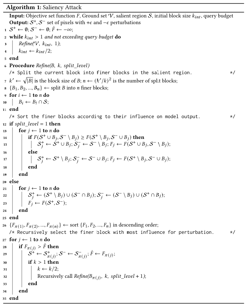 提出的显著性攻击在算法 1 中概述。搜索过程(第 6-35 行)基于图像块的四叉树结构递归地细化扰动,如图 4 所示。具体地,输入图像首先被分割成一些初始块(图 4 中的粗网格),并且只保留显著性区域中的块(第 7-11 行)。然后我们尝试在每个初始块上单独添加 +ϵ+ \epsilon+ϵ 或 −ϵ- \epsilon−ϵ 扰动(第 12-19 行),并根据它们对模型输出的影响 (F)(F)(F) 进行排序(第 26 行)。之后,如果其 FFF 优于当前最佳 F^\hat{F}F^,则选择影响最大的块进行进一步细化(第 27-35 行)。然后我们递归地细化当前最佳块(第 32 行),将该块分割成更小的块(图 4 中的更细网格),并再次尝试在每个块上单独添加扰动(此时为了方便,我们只是翻转扰动(第 21-24 行),例如将 +ϵ+ \epsilon+ϵ 翻转为 −ϵ- \epsilon−ϵ),以找到最佳的小块。细化过程递归进行,直到达到最小块(例如,1 个像素,第 30 行)或没有更小的块具有更好的 FFF(第 28 行)。之后,我们回溯到上一个拆分级别,并使用第二好的块进行进一步扰动。通过这种方式,最重要的块会被优先探索,扰动可以尽可能小,无需像 Parsimonious Attack [22] 那样初始化全局扰动。