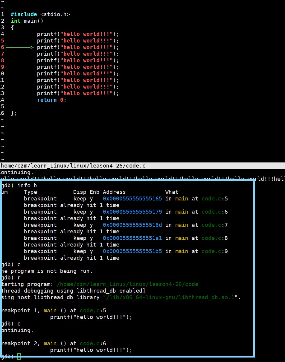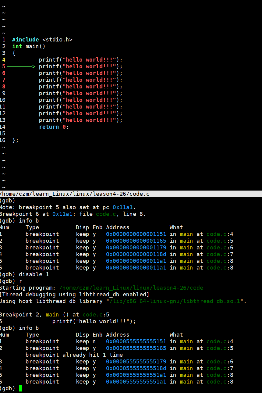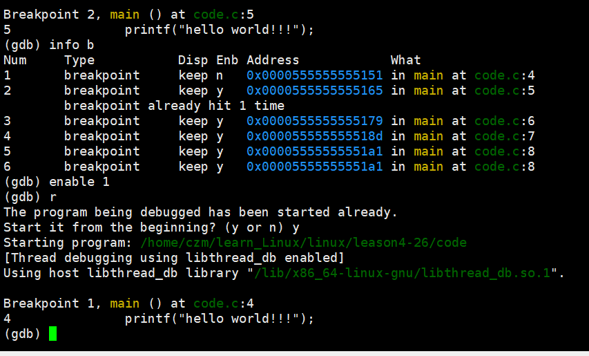 下面的图可以看出第一个断点是行号为 4 的,使用disable后没有删除这个断点,但是 r 后执行到了第二个断点标记的行号